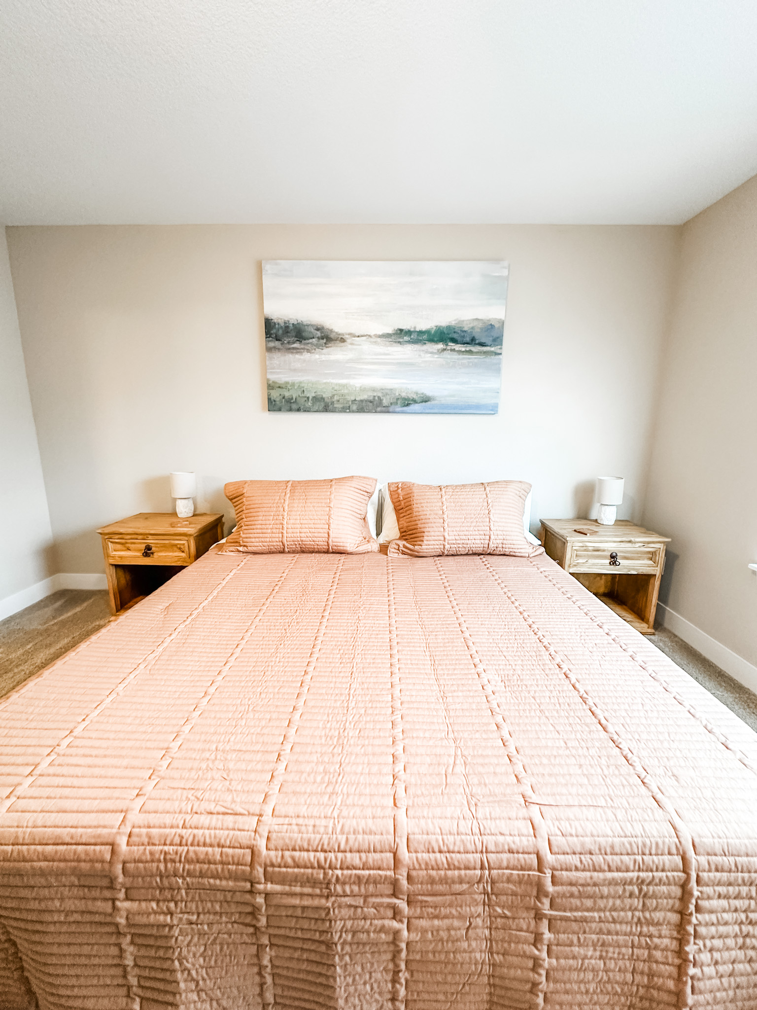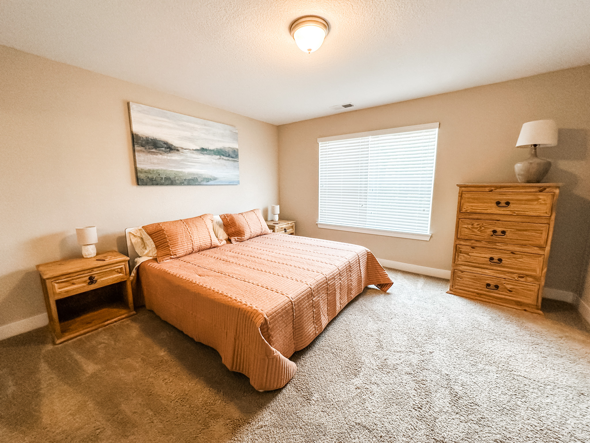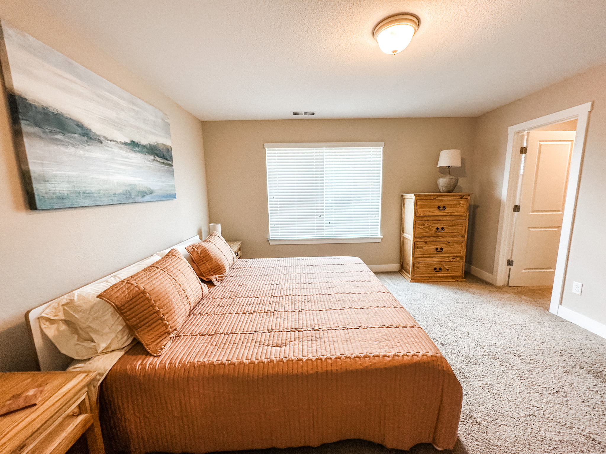The primary suite includes a king-sized bed, ample closet space, and an ensuite bathroom. The additional bedroom is perfect for accommodating guests. Outside, you’ll enjoy a spacious patio for relaxation.